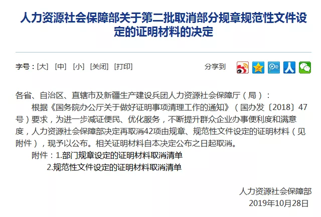 继今年3月份人社部取消73项证明材料后,为进一步减证便民、优化服务,近日人社部决定再取消42项证明材料: