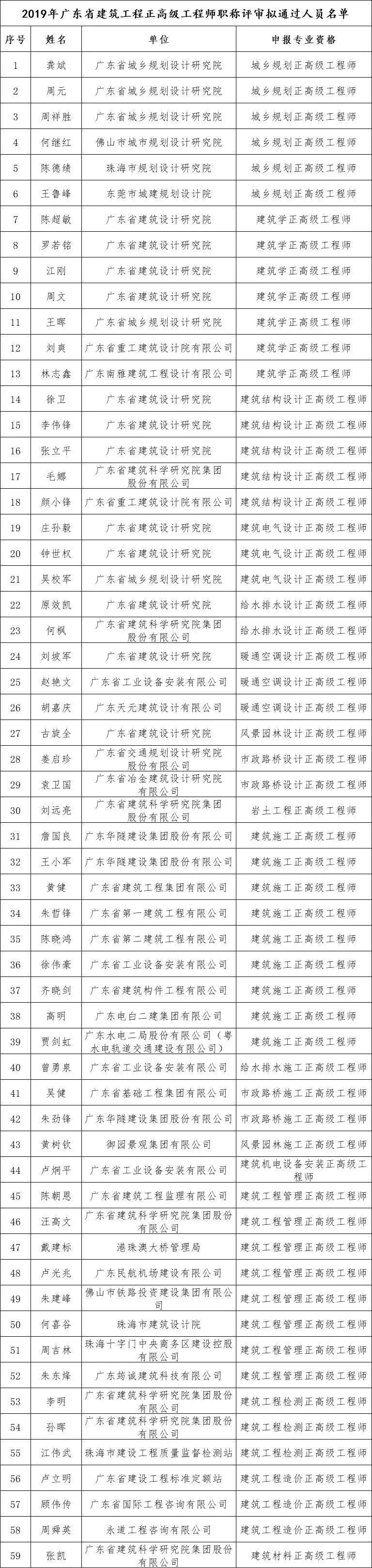 经广东省建筑工程技术高级专业技术资格评审委员会评审,广东省城乡规划设计研究院 龚斌等59人通过正高级工程师职称评审 (名单见附件),现予以公示。