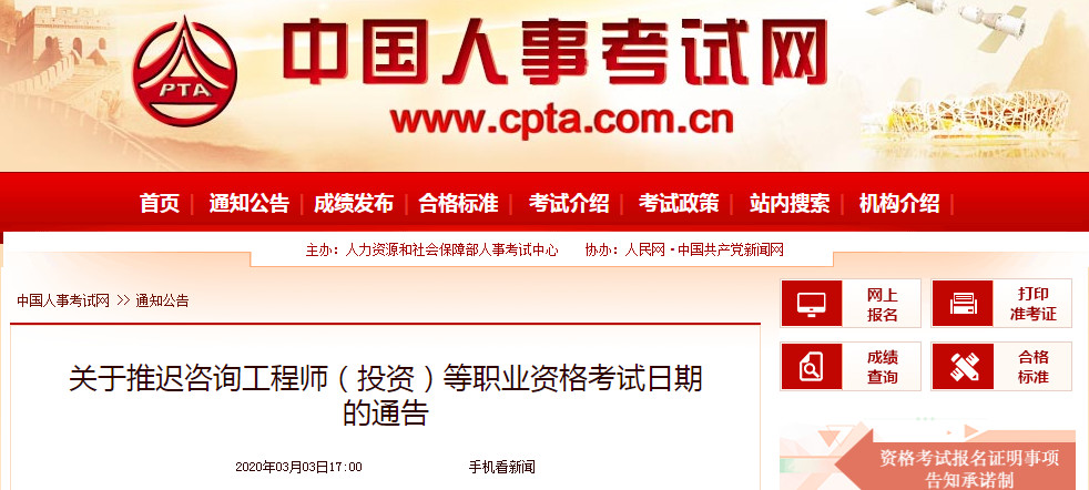 《关于推迟咨询工程师(投资)等职业 资格考试日期通告》