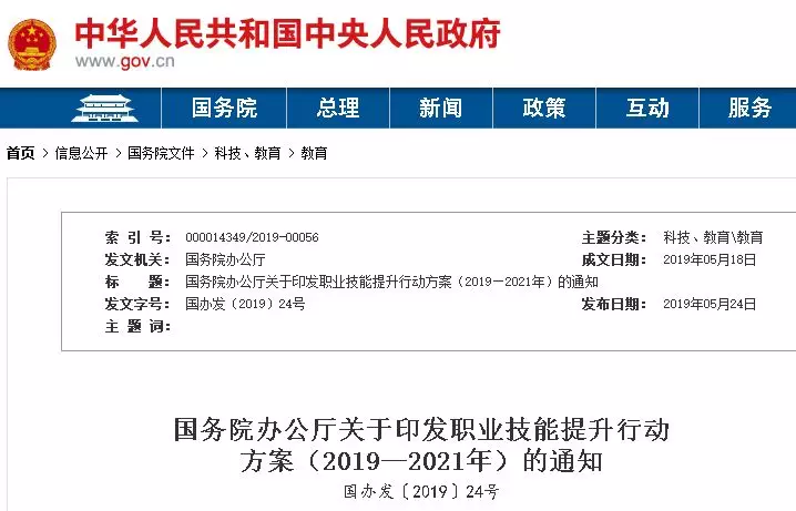 国务院印发《职业技能提升行动方案(2019—2021年)》: