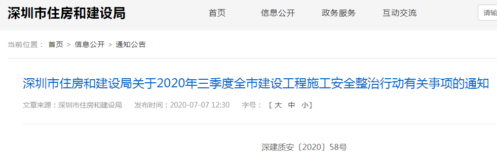 深圳住建局:关于2020年三季度全市建设工程施工安全整治行动有关事项的通知