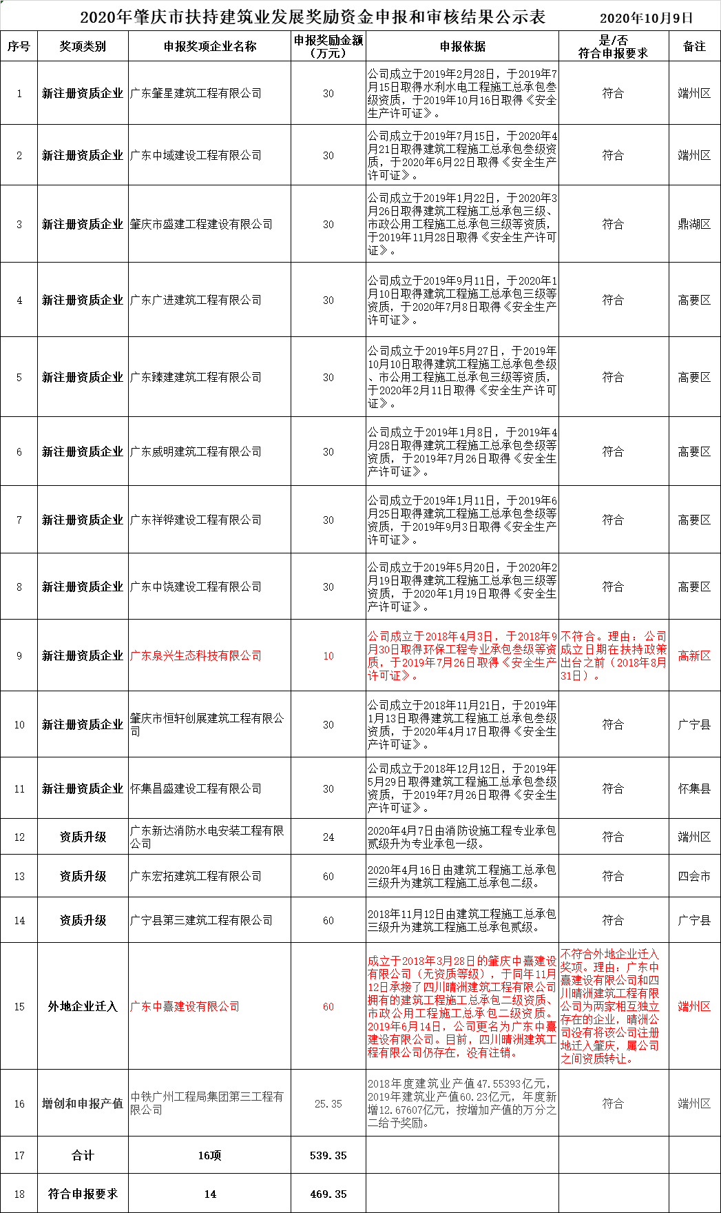 关于2020年肇庆市扶持建筑业发展奖励资金申报和审核结果的公示