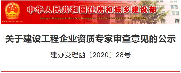 按照《行政许可法》及有关建设工程企业资质管理规定,我部对近期申请建设工程企业资质的申报材料组织了专家审查,现将专家审查意见在住房城乡建设部门户网站(http://www.mohurd.gov.cn)予以公示,以广泛接受社会监督。企业申报材料中的人员、代表工程业绩等详细情况,可通过点击“住房城乡建设部网站主页→建设工程企业资质行政审批专栏→资质申报基本信息公示”进行查询。