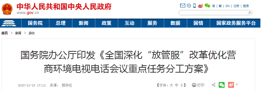 国务院办公厅:全国深化“放管服”改革优化营商环境电视电话会议重点任务分工方案