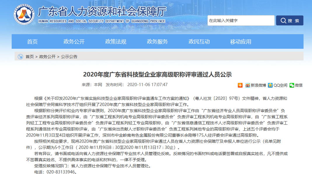 根据职称分类评价和业内专家评审原则,2020年度广东省科技型企业家高级职称评审工作由“广东省经济专业人员高级职称评审委员会”负责评审经济系列高级职称评审,由“广东省工程系列机电专业高级职称评审委员会”负责评审工程系列机电专业高级职称评审,由“广东省工程系列轻工工程专业高级职称评审委员会”负责评审工程系列轻工专业高级职称,由“广东省信息通信工程技术人才高级职称评审委员会”负责评审工程系列通信技术专业高级职称评审,由“广东省突出贡献人才职称评审委员会”负责工程系列其他专业的高级职称评审,上述五个评委会均于2020年11月3日至4日组织开展评审工作,深圳市中金岭南有色金属股份有限公司董事长余刚等175人经评委会评审通过高级职称。
