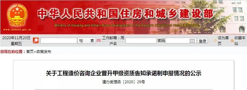 住建部关于工程造价咨询企业晋升甲级资质告知承诺制申报情况的公示