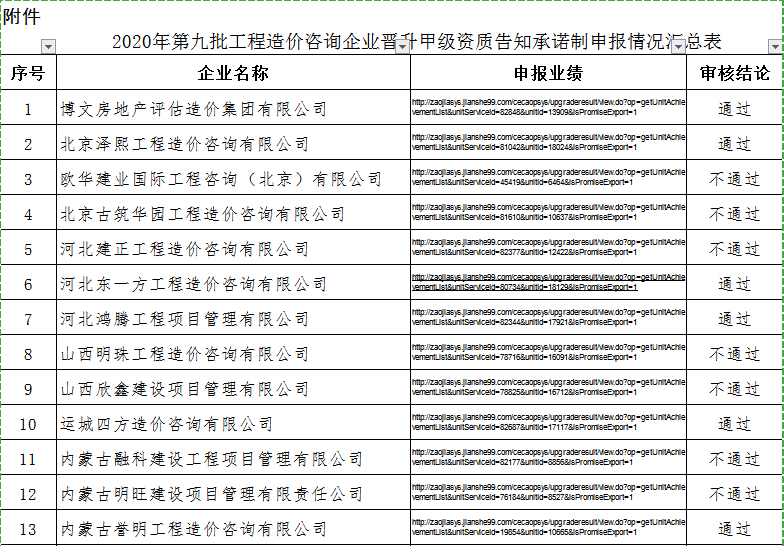 根据《工程造价咨询企业管理办法》(建设部令第149号)及《住房和城乡建设部办公厅关于实行工程造价咨询甲级资质审批告知承诺制的通知》(建办标〔2020〕18号)有关规定,现将工程造价咨询企业晋升甲级资质告知承诺制的申报情况予以公示。审核意见为不同意的企业可通过“住房城乡建设部网站主页→政务服务平台→热门服务→受理发证信息查询”查询具体意见。公示期为:自本公示发布之日起10个工作日(2020年11月19日至2020年12月12日)。