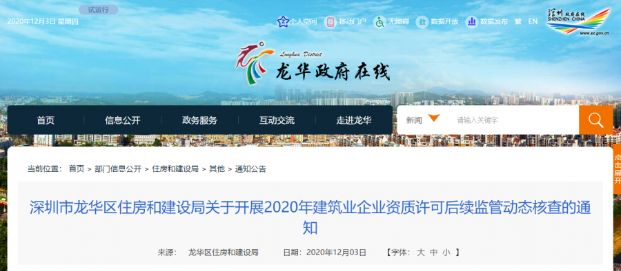 深圳市龙华区住房和建设局关于开展2020年建筑业企业资质许可后续监管动态核查的通知