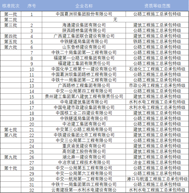 据相关统计,截至2020年12月11日,住建部已公布 10批 施工企业 资质核准名单,共审批 59 家企业的特级资质申请, 32 家企业成功申请特级资质。