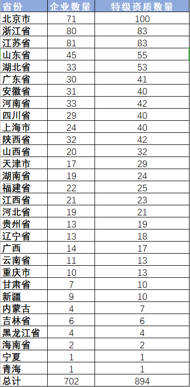 最后,带大家盘点一下全国894个特级资质的地区分布以及702家特级企业都在哪里。