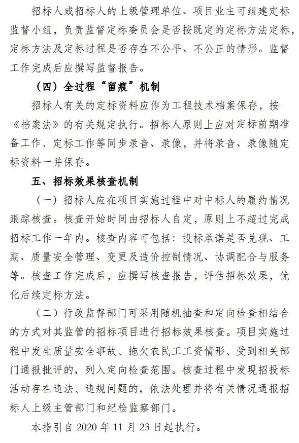 四是以“可追溯”为监管抓手,促进相关主体依法履责。 指引要求 对定标前期准备工作、定标工作等同步录音、录像,并将录音、录像 随定标资料一并保存,建立全过程“留痕”机制。规定招标人应在项目实施过程中对中标人的履约情况跟踪核查,评估招标效果。另外,行政监督部门可采用 随机抽查和定向检查相结合的方式对其监管的招标项目是否存在违法、违规问题进行核查 ,使招标人对中标结果“终身负责”。