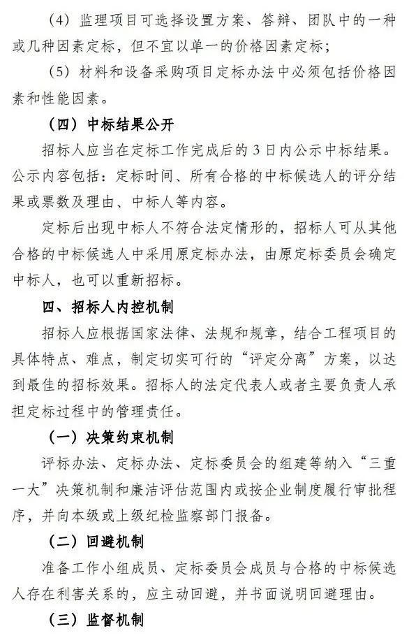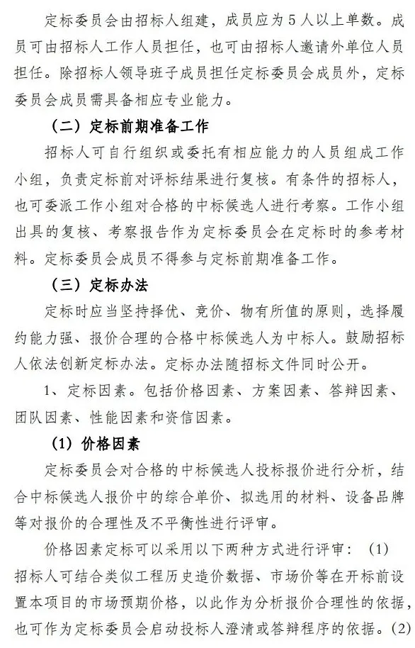 一是以规范的程序为载体,促进招投标过程公平公正。 指引列明了评标、定标、公示、招标人内部决策等程序, 要求招标人将评标办法、定标办法、定标委员会的组建等纳入“三重一大”决策机制和廉洁评估范围 并向本级或上级纪检监察部门报备。为规范定标环节的操作,指引不仅从定标委员会的组建、定标前的准备工作等方面进行了细化规定,还根据不同类型招标项目的具体特点,推荐了6类定标因素,规范招标人的定标决策。同时为实现定标决策程序脉络清晰,指引明确中标人的确定方式 可以是“记名投票+撰写评语”或评分,不鼓励采用随机抽取或集体议事方式确定中标人。