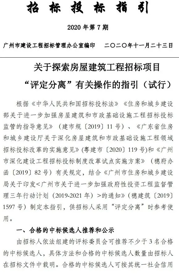 广州版建筑工程招标项目“评定分离”操作指引发布