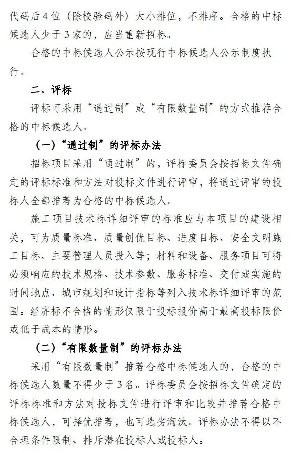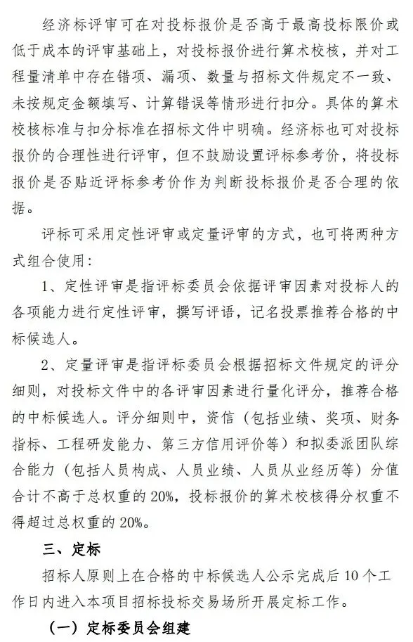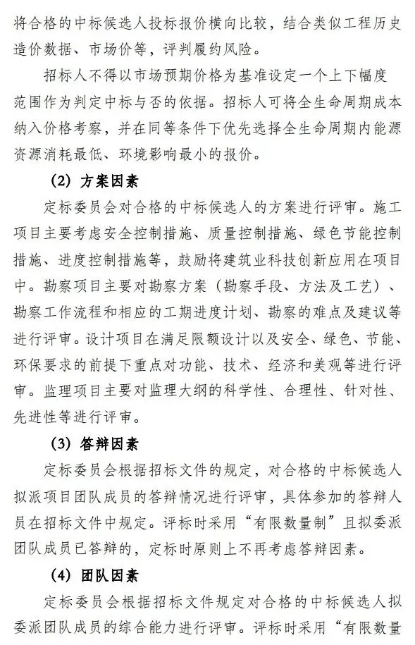 二是以科学的评标定标规则为导向,促进招投标高质量竞争。 指引招标人科学制定“评定分离”方案,在评标阶段引入“通过制”和“有限数量制”两种方式,并对审查标准进行了规定, 强化评标阶段对技术方案的分析、对报价合理性的评审以及对风险的判断。 为压缩“合围优势”,排挤围标串标空间,指引 明确不鼓励设置评标参考价,将投标报价是否贴近评标参考价作为判断投标报价合理性的依据。 在定标阶段,为更好引导招标人对投标报价进行科学评审,指引 提出“市场预期价格” 的概念,招标人 可将此作为分析报价合理性的依据 ,也可据此启动澄清或答辩环节。指引同时明确了定标因素的设置规则, 针对施工和材料设备采购项目,必须对价格因素进行考量,在此基础上可以增加方案、答辩、团队、材料设备性能等因素 ,引导招标人选择产品或服务全寿命周期内成本和质量的最优组合,促进高质量竞争。