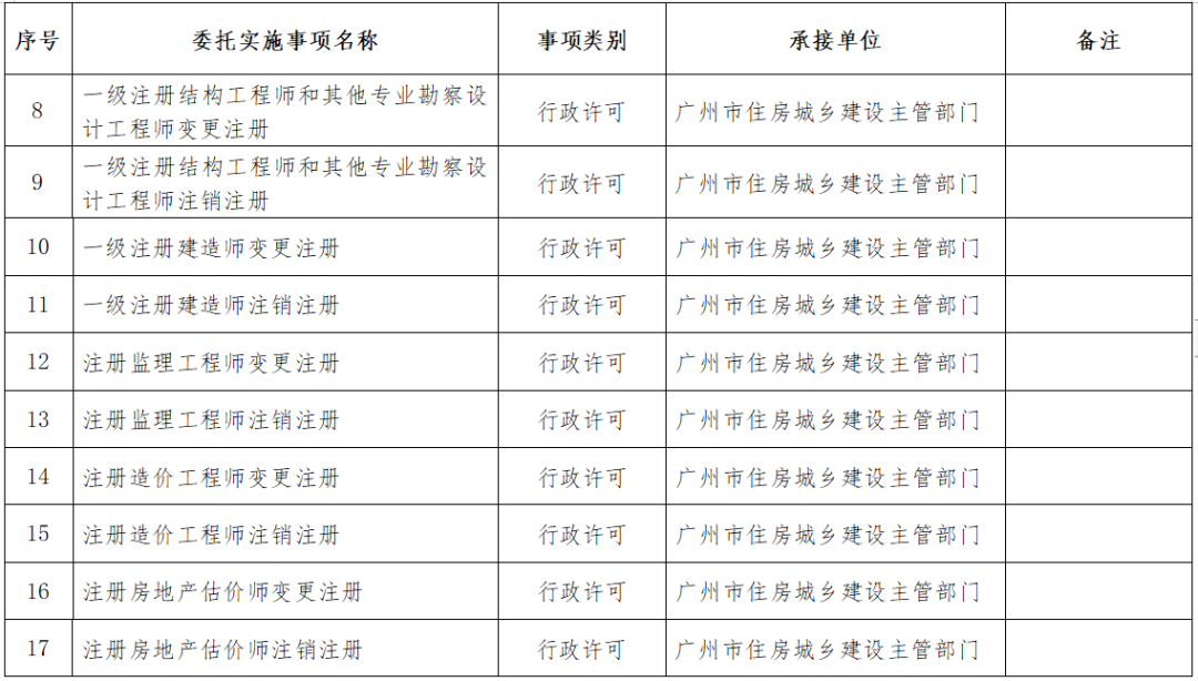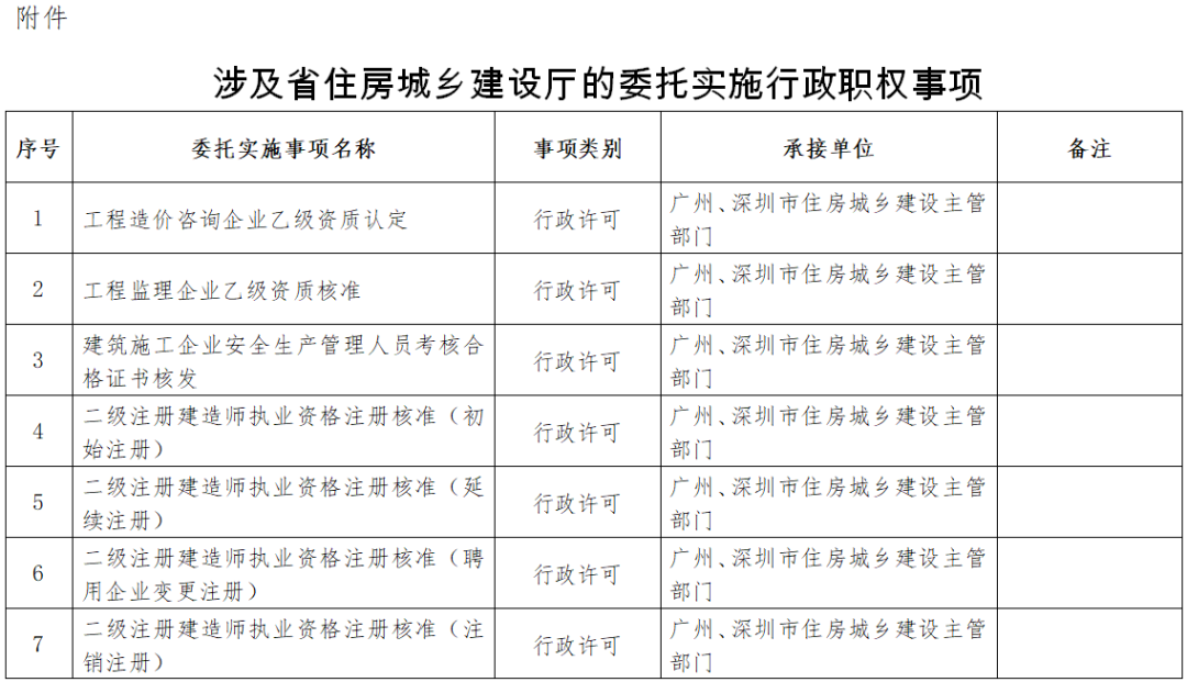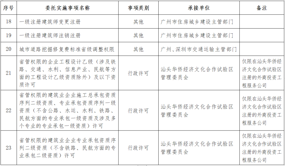 根据《广东省人民政府关于将一批省级行政职权事项调整由广州、深圳市实施的决定》(广东省人民政府令第281号)和《广东省人民政府关于将一批省级行政职权调整由汕头华侨经济文化合作试验区实施的决定》(广东省人民政府令第280号),原由我厅实施的工程造价咨询企业乙级资质认定等23项省级行政职权事项分别委托广州市、深圳市、汕头华侨经济文化合作试验区实施(具体情况见附表)。