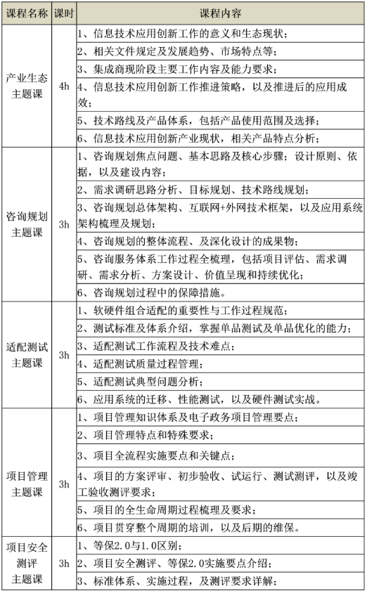 精华班课程以信息技术应用创新产业生态体系为基础、以实际应用为目标、以项目案例为依据,全面系统地讲解信息技术应用创新工作相关的产业生态、咨询规划、适配测试、项目管理、安全测评等内容,为信息技术应用创新工作的顺利推进奠定人才基础。