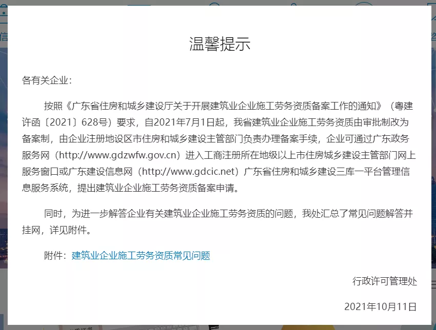 按照 《广东省住房和城乡建设厅关于开展建筑业企业施工劳务资质备案工作的通知》(粤建许函〔2021〕628号) (点击回顾) 要求,自2021年7月1日起,我省建筑业企业施工劳务资质由审批制改为备案制,由企业注册地设区市住房和城乡建设主管部门负责办理备案手续,企业可通过广东政务服务网(http://www.gdzwfw.gov.cn)进入工商注册所在地级以上市住房城乡建设主管部门网上服务窗口或广东建设信息网(http://www.gdcic.net)广东省住房和城乡建设三库一平台管理信息服务系统,提出建筑业企业施工劳务资质备案申请。