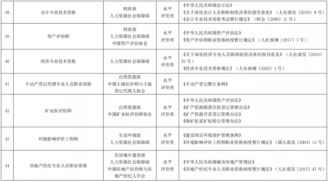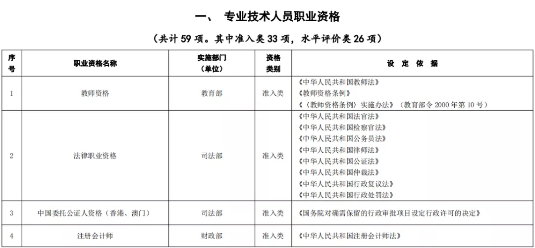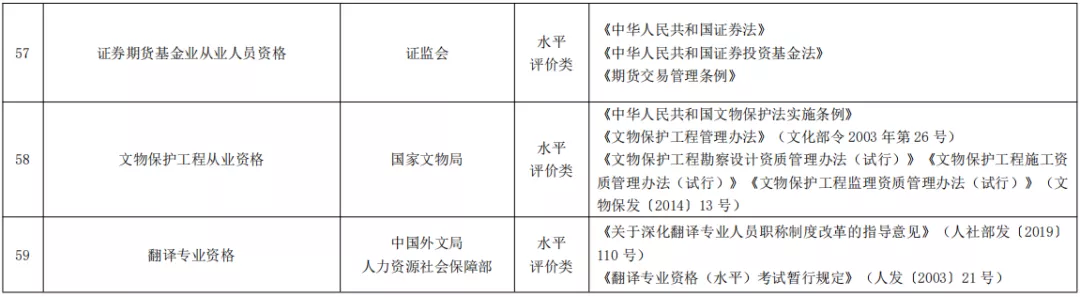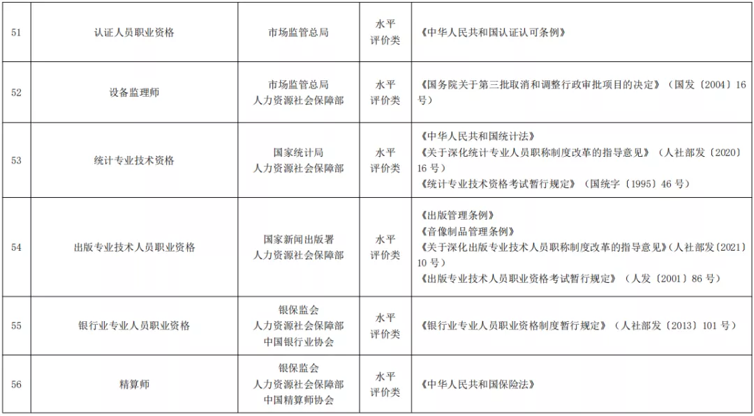 人社部公布《国家职业资格目录(2021年版)》,共计72项职业资格,其中,专业技术人员职业资格59项,含准入类33项,水平评价类26项;技能人员职业资格13项。