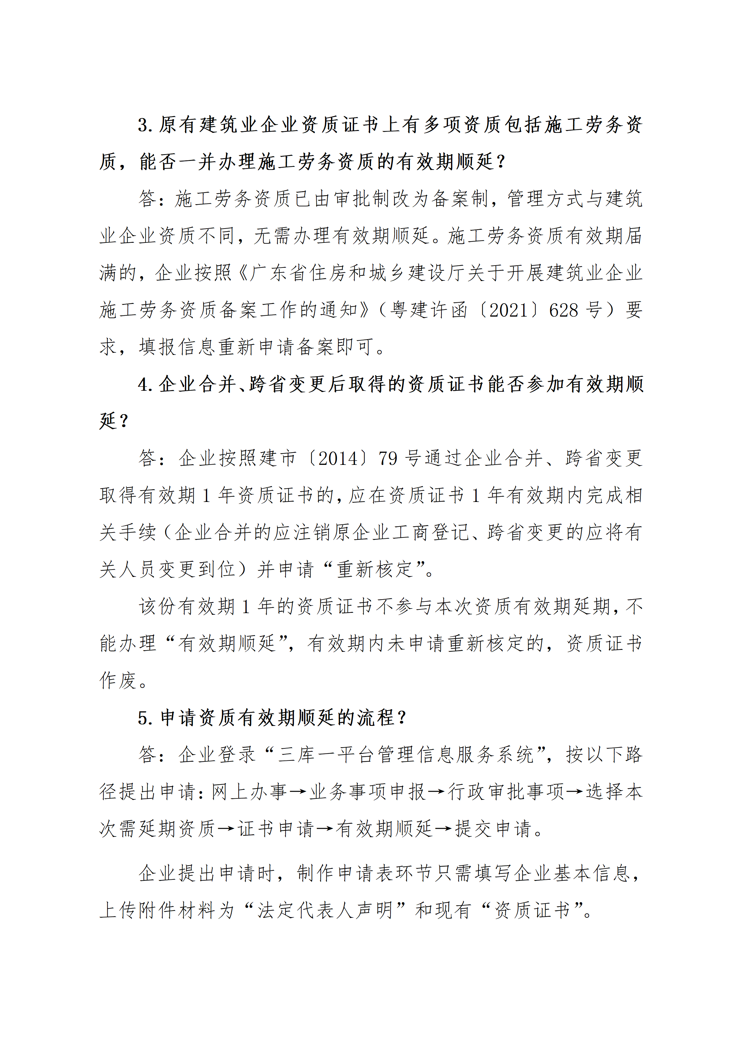 按照《广东省住房和城乡建设厅关于建设工程企业资质有效期延期的通知》(粤建许函〔2021〕849号)要求,我省各级住房城乡建设主管部门核发的 工程勘察、工程设计、建筑业、工程监理、房地产开发企业资质 (含我厅承接的住房和城乡建设部审批权限下放试点事项),证书有效期于2021年12月31日至2022年12月30日届满的, 统一延期至2022年12月31日。企业可申请换发有效期延长至2022年12月31日的资质证书,申请方式为“有效期顺延”。