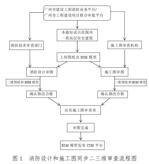 (二)BIM模型审查流程。 申报单位提交二维图纸与BIM模型后,审查流程与现行《广州市住房和城乡建设局关于优化调整建设工程消防设计技术审查工作的通知》(穗建消防〔2021〕327号)中房屋建筑工程的施工图审查与消防设计技术联合审查流程完全一致,流程见图1。