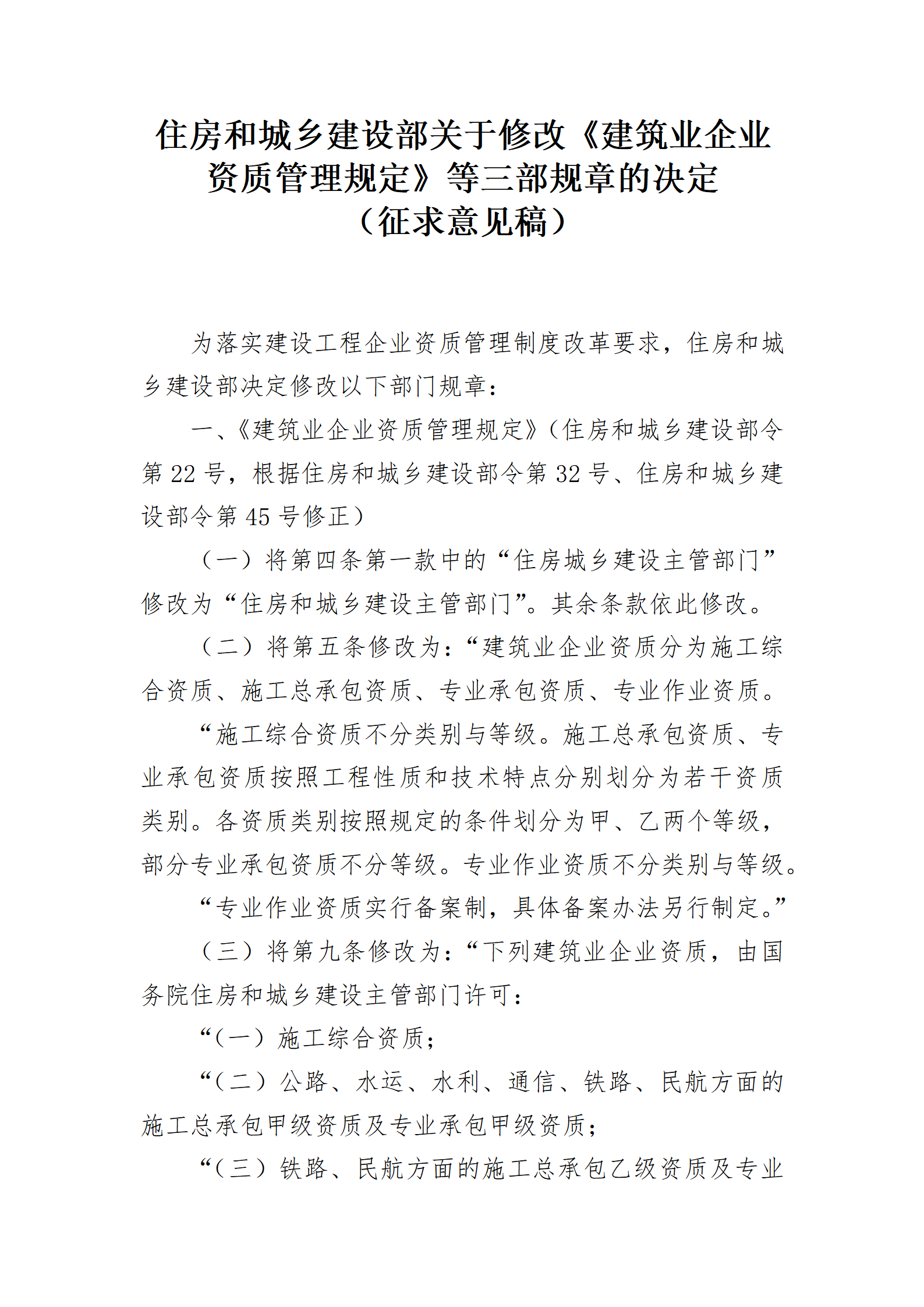 住房和城乡建设部关于《住房和城乡建设部关于修改〈建筑业企业资质管理规定〉等三部规章的决定(征求意见稿)》公开征求意见的通知