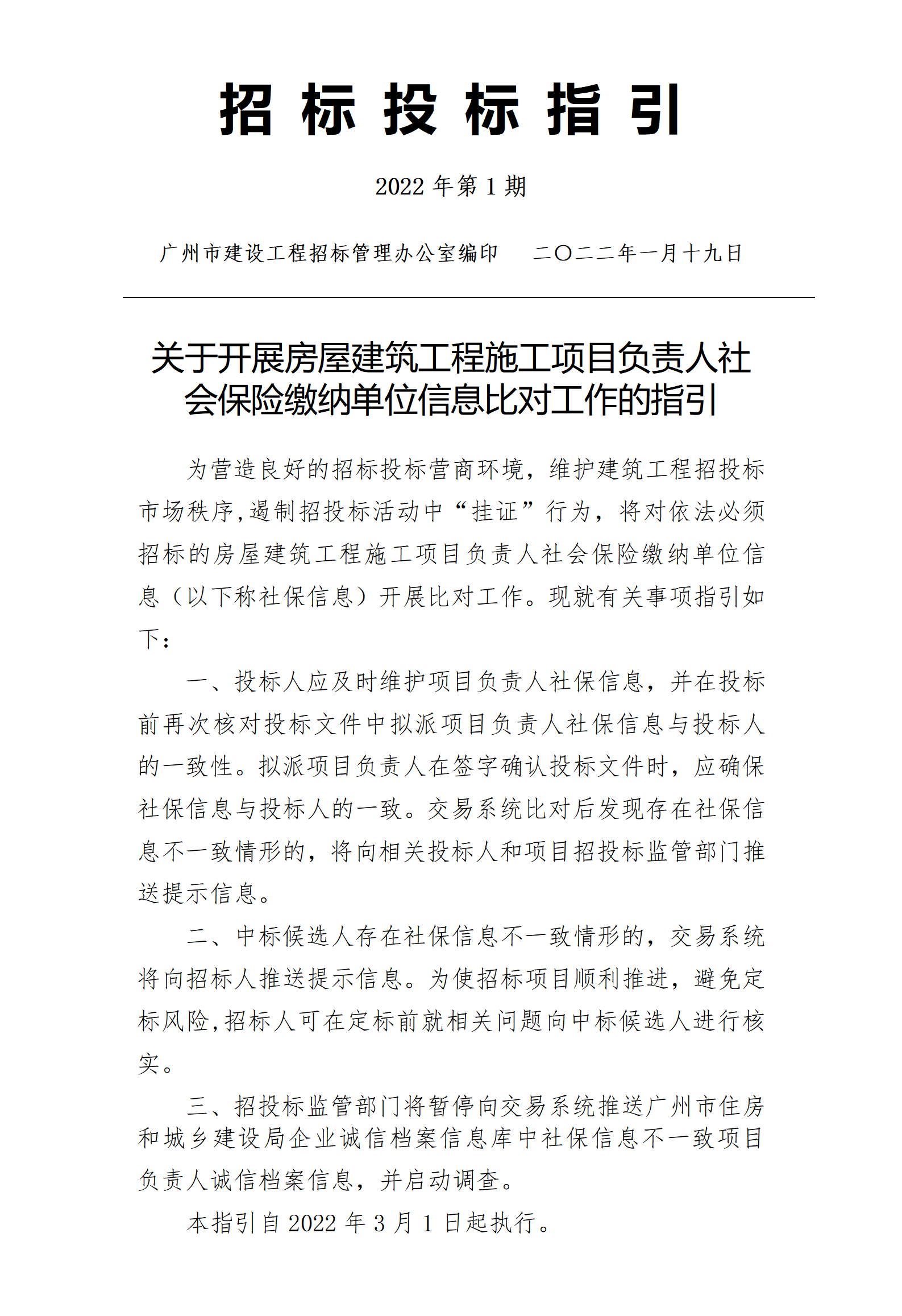 2022年伊始,广州市建设工程招标管理办公室发布了 《关于开展房屋建筑工程施工项目负责人社会保险缴纳单位信息比对工作的指引》(以下简称《社保信息比对指引》), 通过交易系统自动比对项目负责人社会保险缴纳单位信息,查处打击招投标活动“挂证”行为,进一步维护广州市建筑工程市场秩序,营造良好的招标投标营商环境。