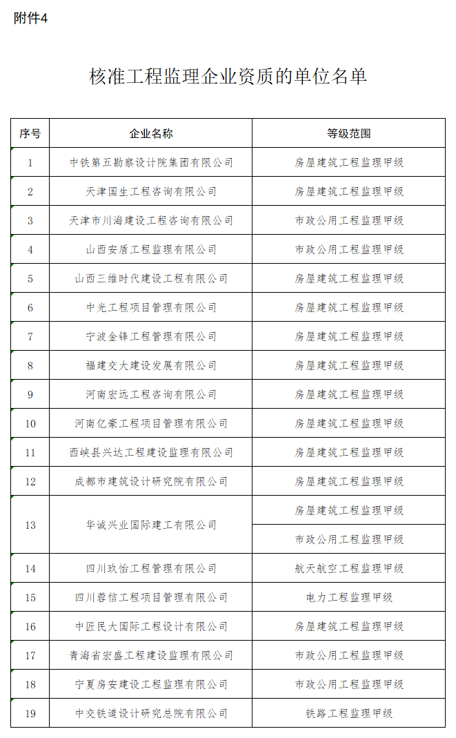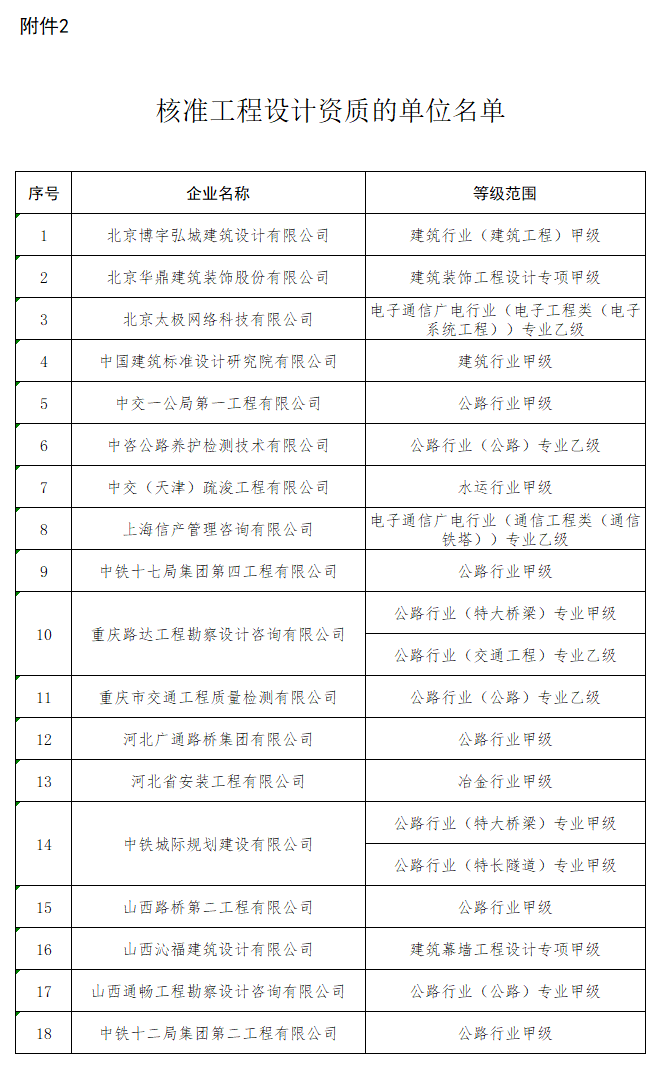 根据《中华人民共和国建筑法》及有关建设工程企业资质管理规定,现将我部核准的工程勘察资质、工程设计资质、建筑业企业资质、工程监理企业资质的单位名单(2022年度第二批)予以公布。未予核准的单位及原因可登录住房和城乡建设部门户网站-政务服务平台,点击办事服务中“申请事项办理进度查询(受理发证信息查询)”栏目进行查询。