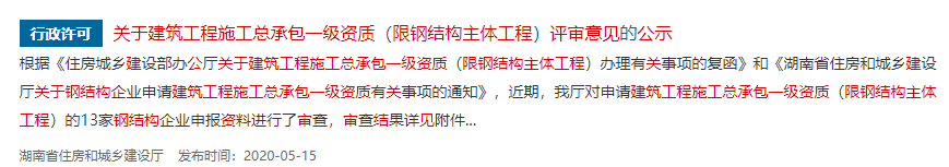 2020年5月15日,湖南省住建厅发布一份关于建筑工程施工总承包一级资质(限钢结构主体工程)评审意见的公示,对申请建筑工程施工总承包一级资质(限钢结构主体工程)的13家钢结构企业申报资料进行了审查。其中 10家同意推荐,3家不同意推荐,同意率达77%。