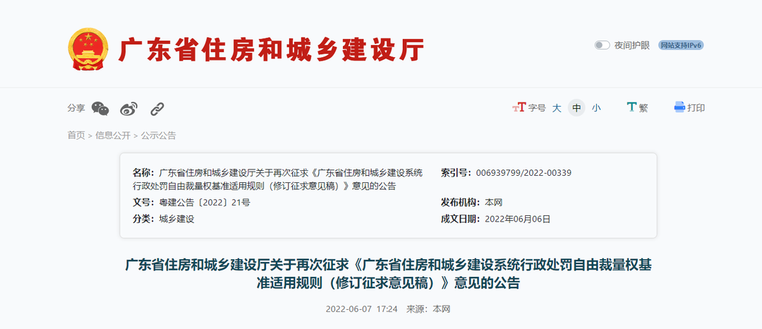 广东省住建厅:再次征求广东省住房和城乡建设系统行政处罚意见