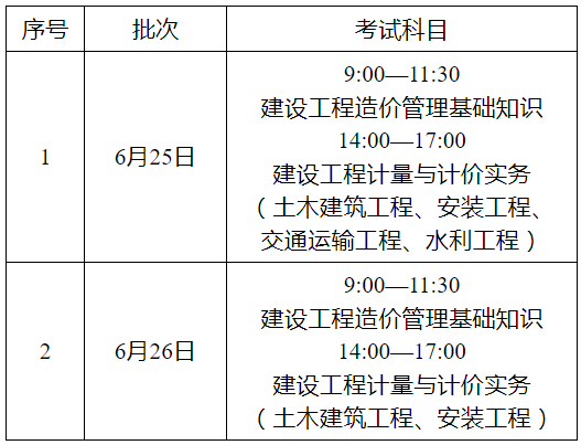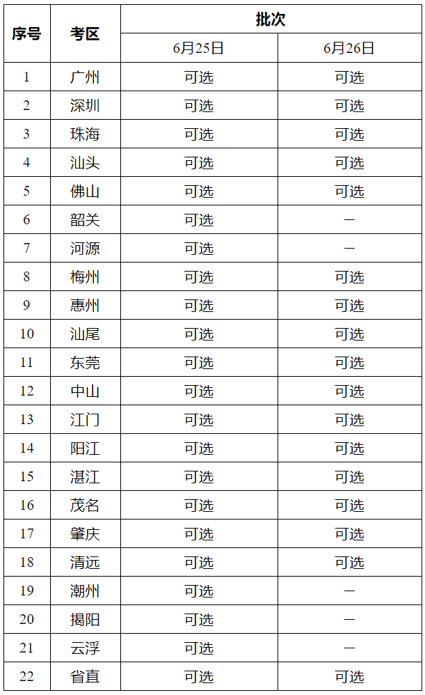 6月25—26日每日安排1个批次,共2个批次 。各考区的批次安排不同,具体详见附件1。