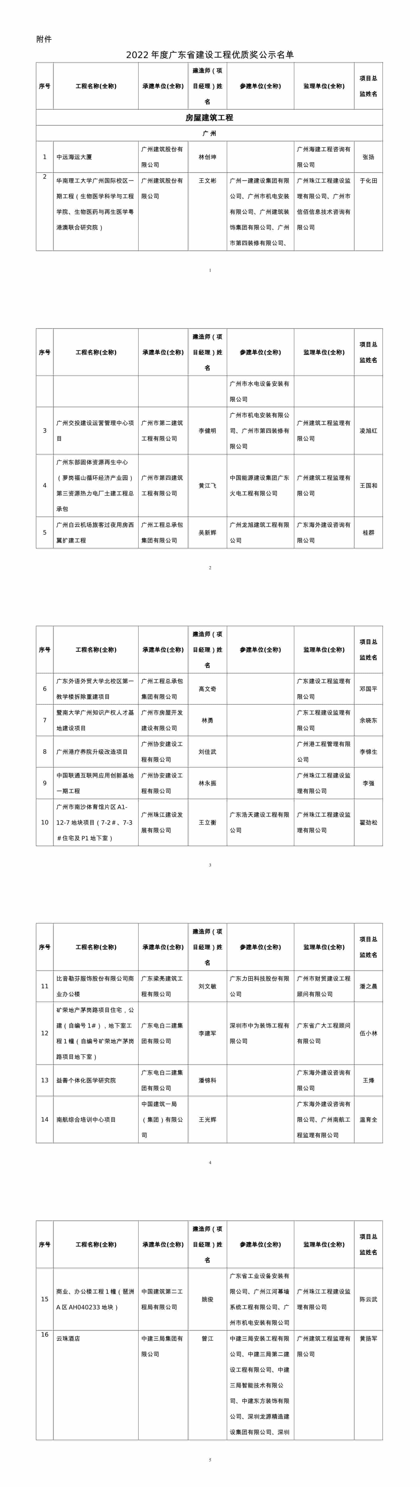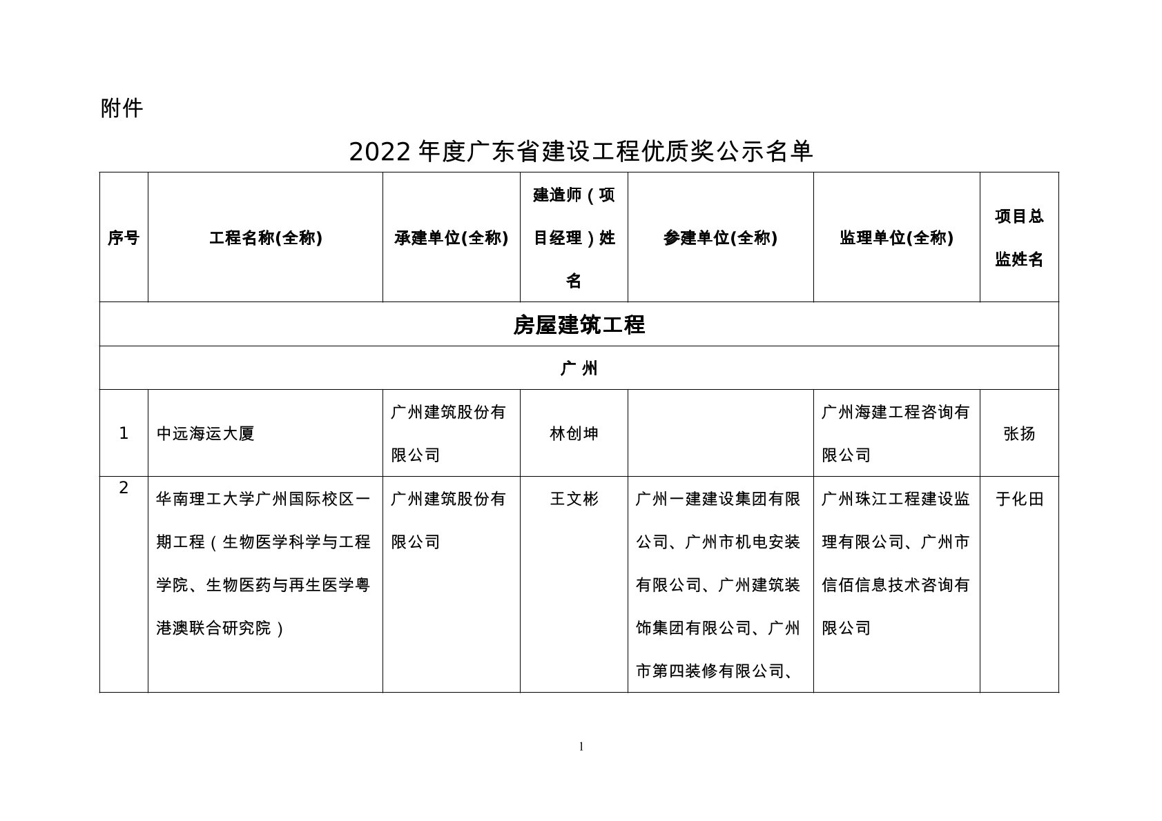 2022年度省建设工程优质奖评选工作已经结束,根据《广东省建设工程优质奖评选办法》,我协会决定对获得2022年度省建设工程优质奖及省房屋市政工程安全生产文明施工示范工地(或相关省级安全生产文明施工示范工地) 的87项工程授予2022年度广东省建设工程金匠奖称号 。现将该87项工程的工程名称、承建单位、参建单位、监理单位及建造师(项目经理)、项目总监名单(见附件)予以公示,公示期为7天。公示期内任何单位、个人如有异议,可向我协会反映。反映的内容应实事求是,以单位名义反映的,应加盖公章;以个人名义反映的,应署明真实姓名和联系电话。