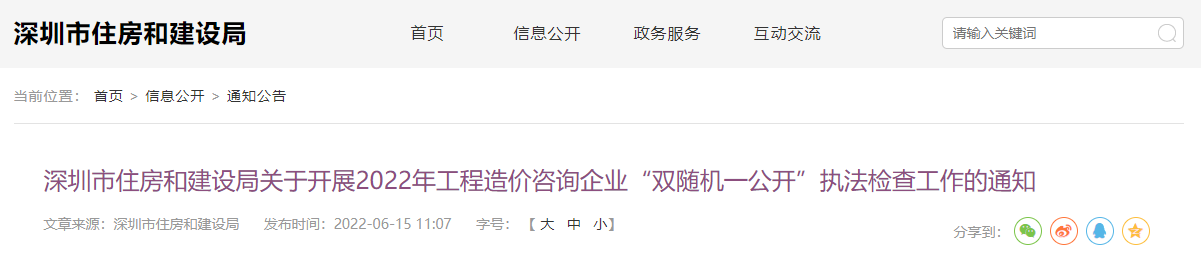 深圳住建局:关于开展2022年工程造价咨询企业“双随机一公开”执法检查工作的通知