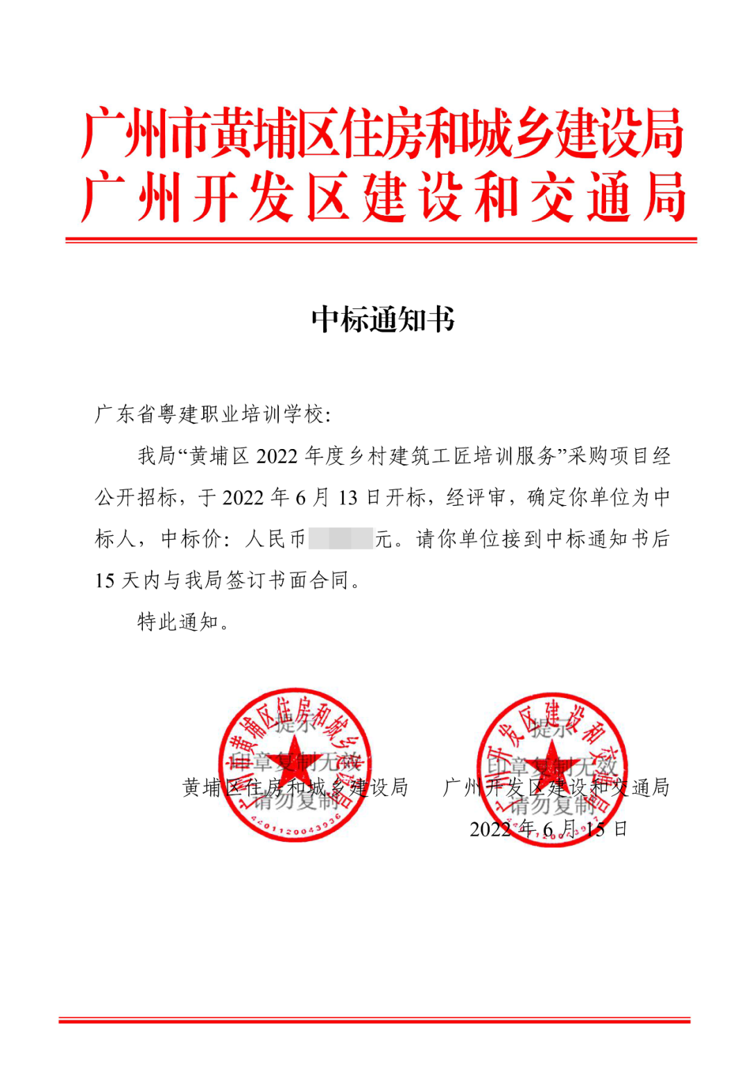 近日,粤建职校收到广州市黄埔区住房和城乡建设局、广州开发区建设和交通局联合发出的《中标通知书》,该《中标通知书》显示,我校成功中标“黄埔区2022年度乡村建筑工匠培训服务”采购项目。