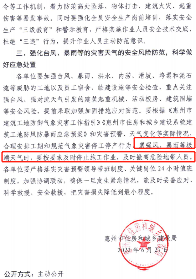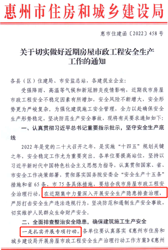 近日,惠州市住建局发布了关于切实做好近期房屋市政工程安全生产工作的通知。
