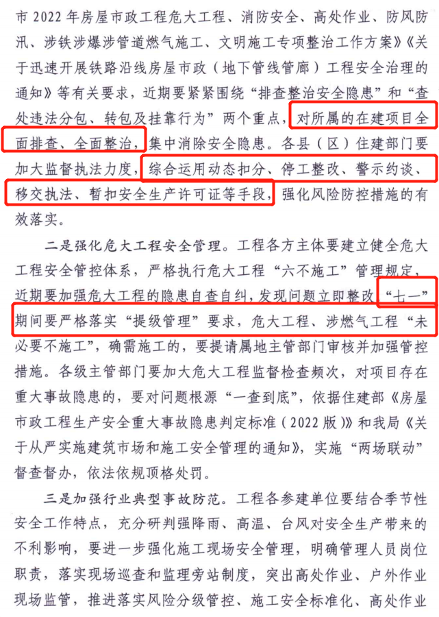 2、各县(区)住建部门要加大监督执法力度,综合运用 动态扣分、停工整改、警示约谈、移交执法、暂扣安全生产许可证 等手段,强化风险防控措施的有效落实。