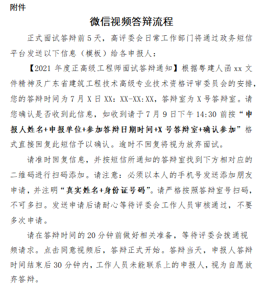 (一)高评 委会日常工作部门面试答辩前7天在省住房城乡建设厅网站(http://zfcxjst.gd.gov.cn/)公布面试答辩时间,由各主管单位通知本单位的申报人。 在正式面试答辩前5天, 高评委会日常工作部门通过 短信平台 把申报人的 答辩时间等具体要求以短信形式 发至其手机, 申报人按要求进行回复确认并用本人实名制微信添加答辩室微信号(详见附件) 。 在答辩前3天 ,高评委会日常工作部门对确认记录进行汇总, 已确认回复的视为已接到答辩的通知并确认参加 ;未回复的由高评委会日常工作部门再次发送信息或电话联系其单位或本人,确保每位申报人都接收到答辩的通知。 面试前1天还未确认回复的,视为放弃面试答辩 。