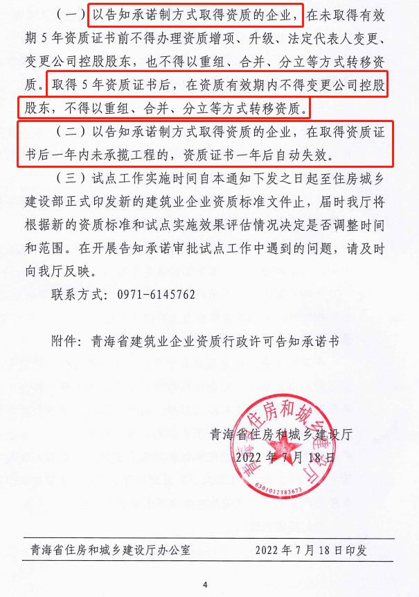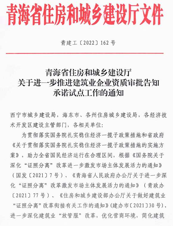青海省住建厅发布《关于进一步推进建筑业企业资质审批告知承诺试点工作的通知》,明确: