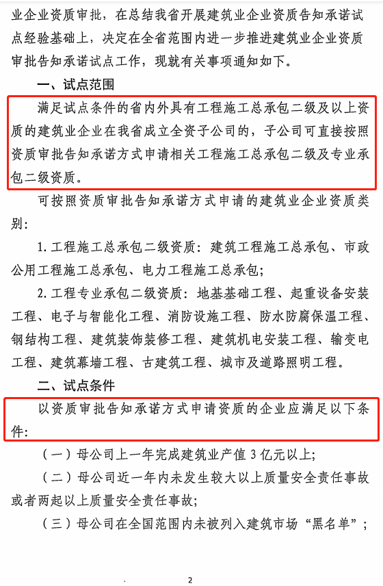 满足试点条件的省内外具有 工程施工总承包二级及以上资质 的建筑业企业在我省成立全资子公司的, 子公司可直接按照资质审批告知承诺方式申请相关工程施工总承包二级及专业承包二级资质 。