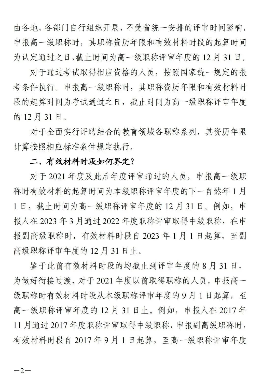 (一)对于2021年度及此后评审取得职称的人员,评审高一级职称时,职称资历年限和有效材料时段的起算时间为本级职称评审年度的下一自然年1月1日,截止时间为高一级职称评审年度的12月31日。