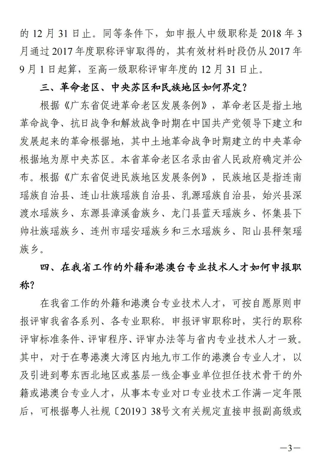 2、对于引进到粤东西北地区或基层一线企事业单位担任技术骨干,具有大学本科、硕士研究生、博士研究生学历的外籍和港澳台专业人才,可参照粤人社规〔2019〕38号文有关规定直接申报副高级或正高级职称。