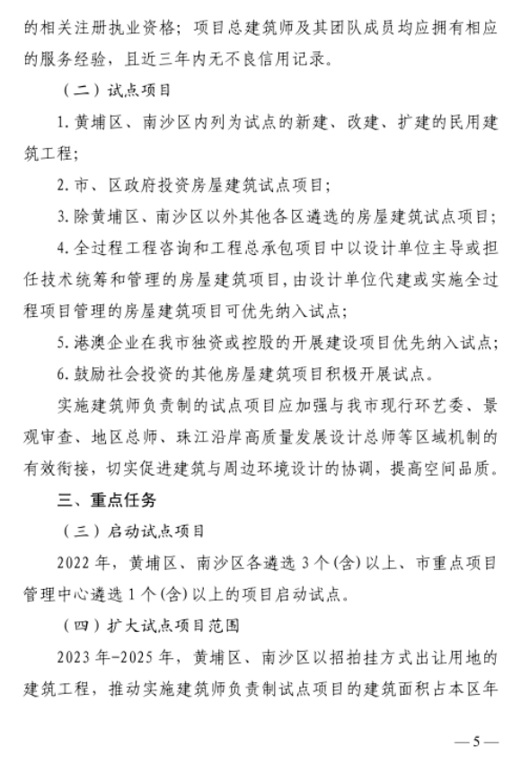 2022年,黄埔区、南沙区各遴选3个(含)以上、市重点项目管理中心遴选1个(含)以上项目启动试点。2023年至2025年,黄埔区、南沙区以招拍挂方式出让用地的建筑工程,安排实施建筑师负责制试点项目的建筑面积占本区年度新出让用地总建筑面积比例不低于30%;其他各区不低于10%。市、区安排实施建筑师负责制的政府投资试点项目比例应不低于本年度新开工项目数的10%。