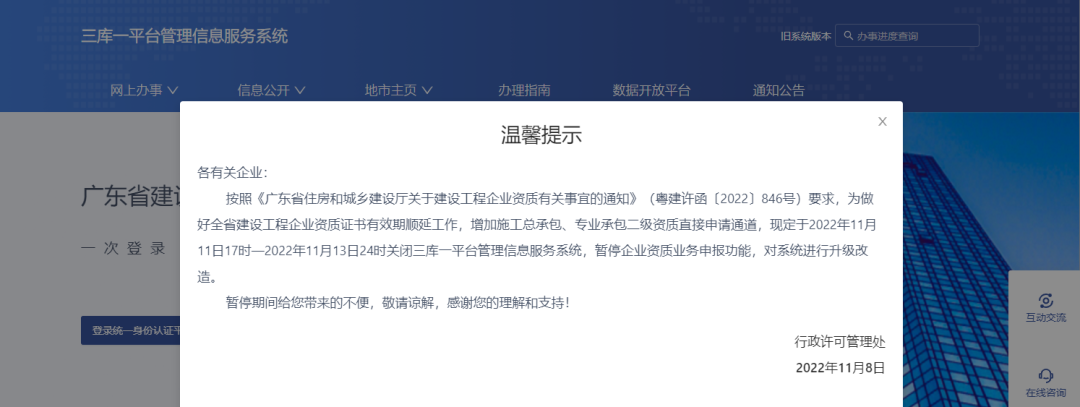 11月11日17时—13日关闭三库一平台,暂停企业资质业务申报功能