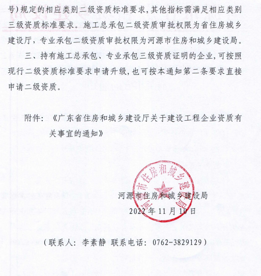 11月18日,河源市住房和城乡建设局转发广东省住房和城乡建设厅关于建设工程企业资质有关事宜的通知。