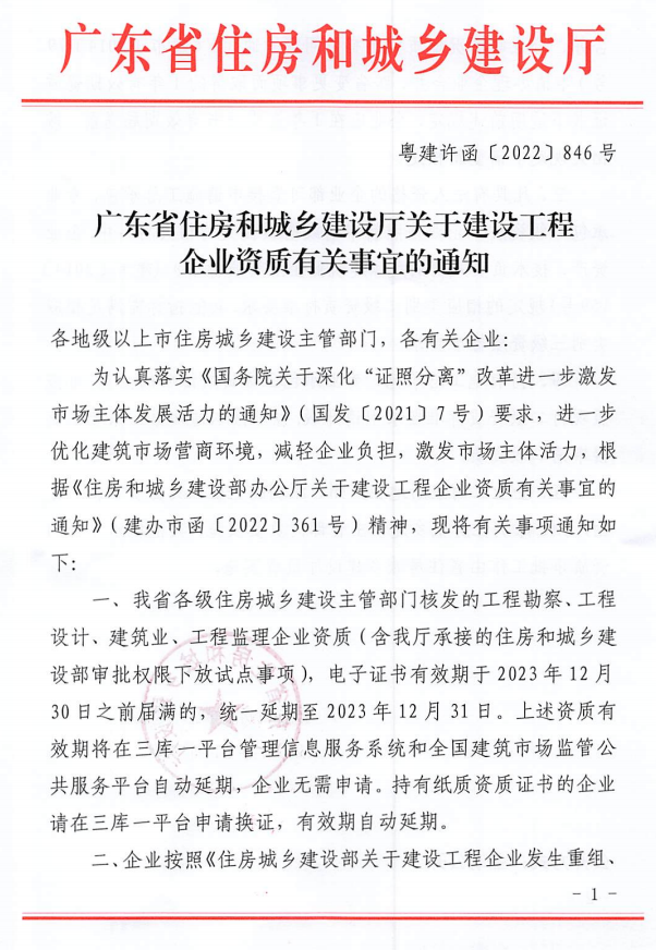 为认真落实《国务院关于深化“证照分离”改革进一步激发市场主体发展活力的通知》(国发〔2021〕7号)要求,进一步优化建筑市场营商环境,减轻企业负担,激发市场主体活力,现将《广东省住房和城乡建设厅关于建设工程企业资质有关事宜的通知》(粤建许函〔2022〕846号),(以下简称《通知》)转发给你们,请按如下意见一并执行: