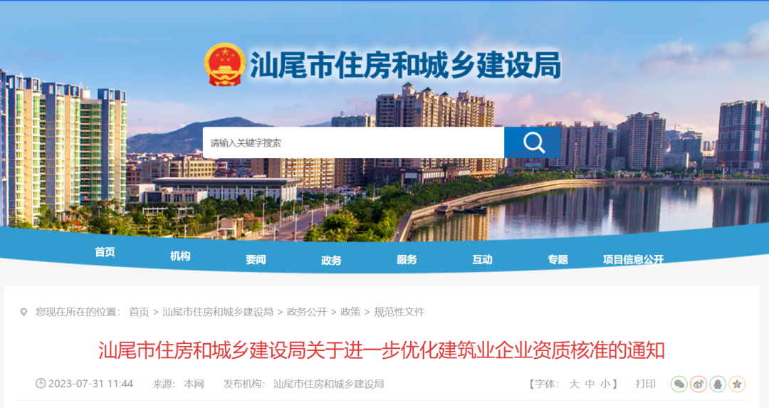 汕尾市住房和城乡建设局关于进一步优化建筑业企业资质核准的通知