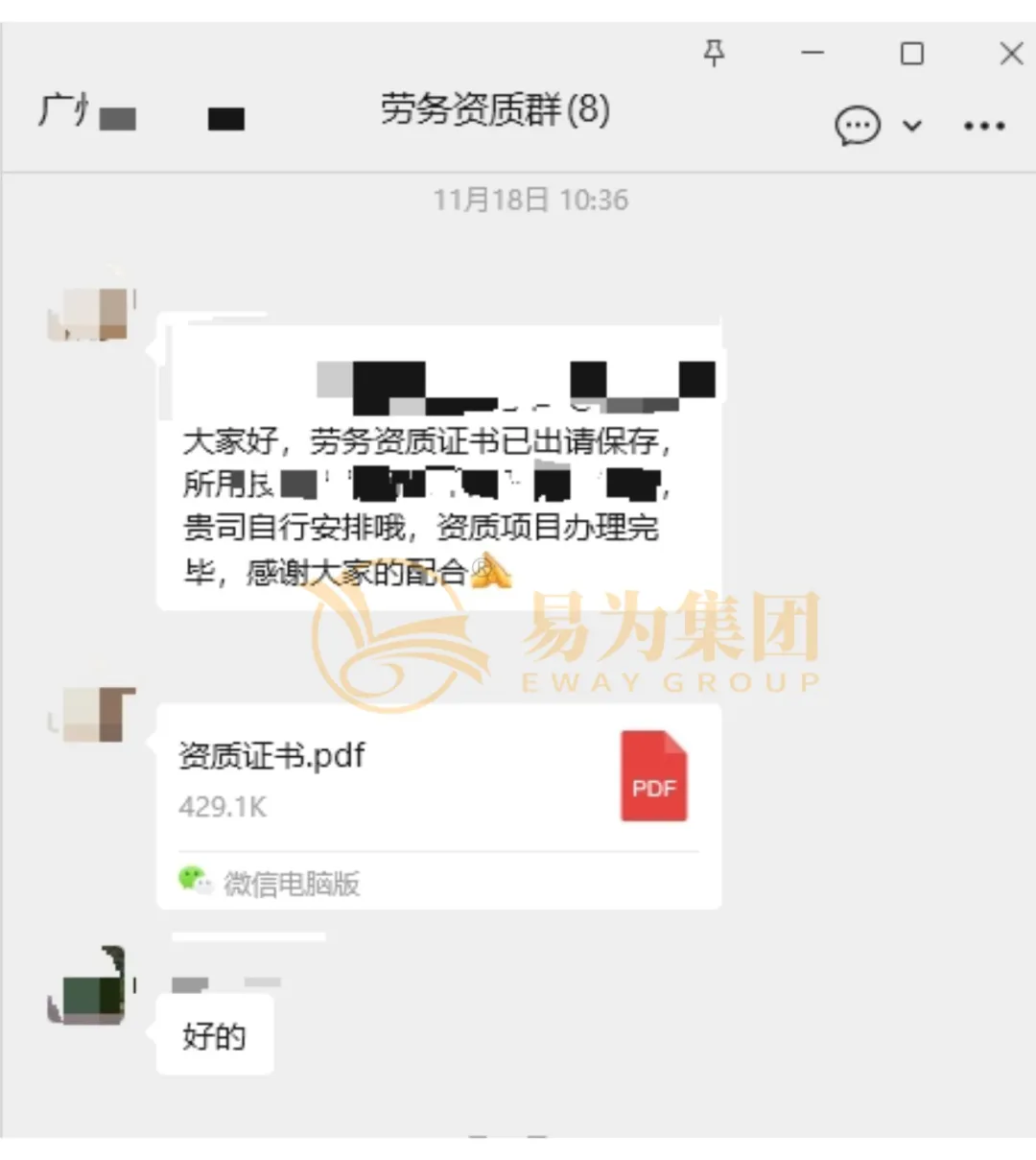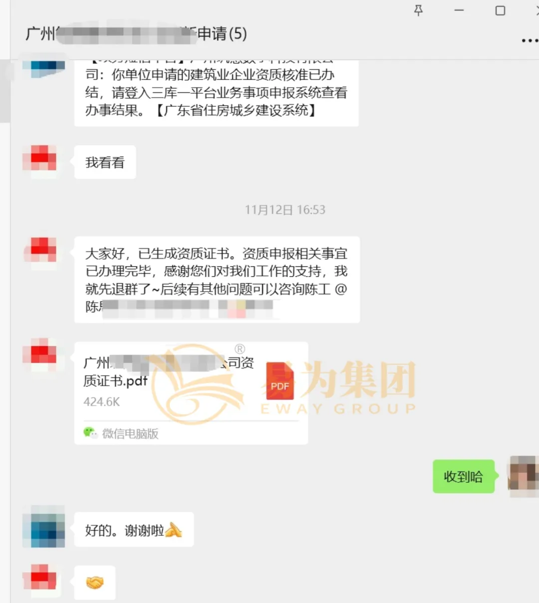 从材料重整到最终通过 审核,只用了 12 天。张经理拿着新的电子资质证书发来感谢消息 !