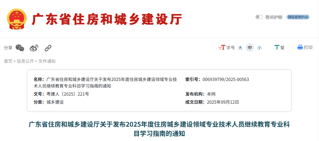 广东省住房和城乡建设厅关于发布2025年度住房城乡建设领域专业技术人员继续教育专业科目学习指南的通知