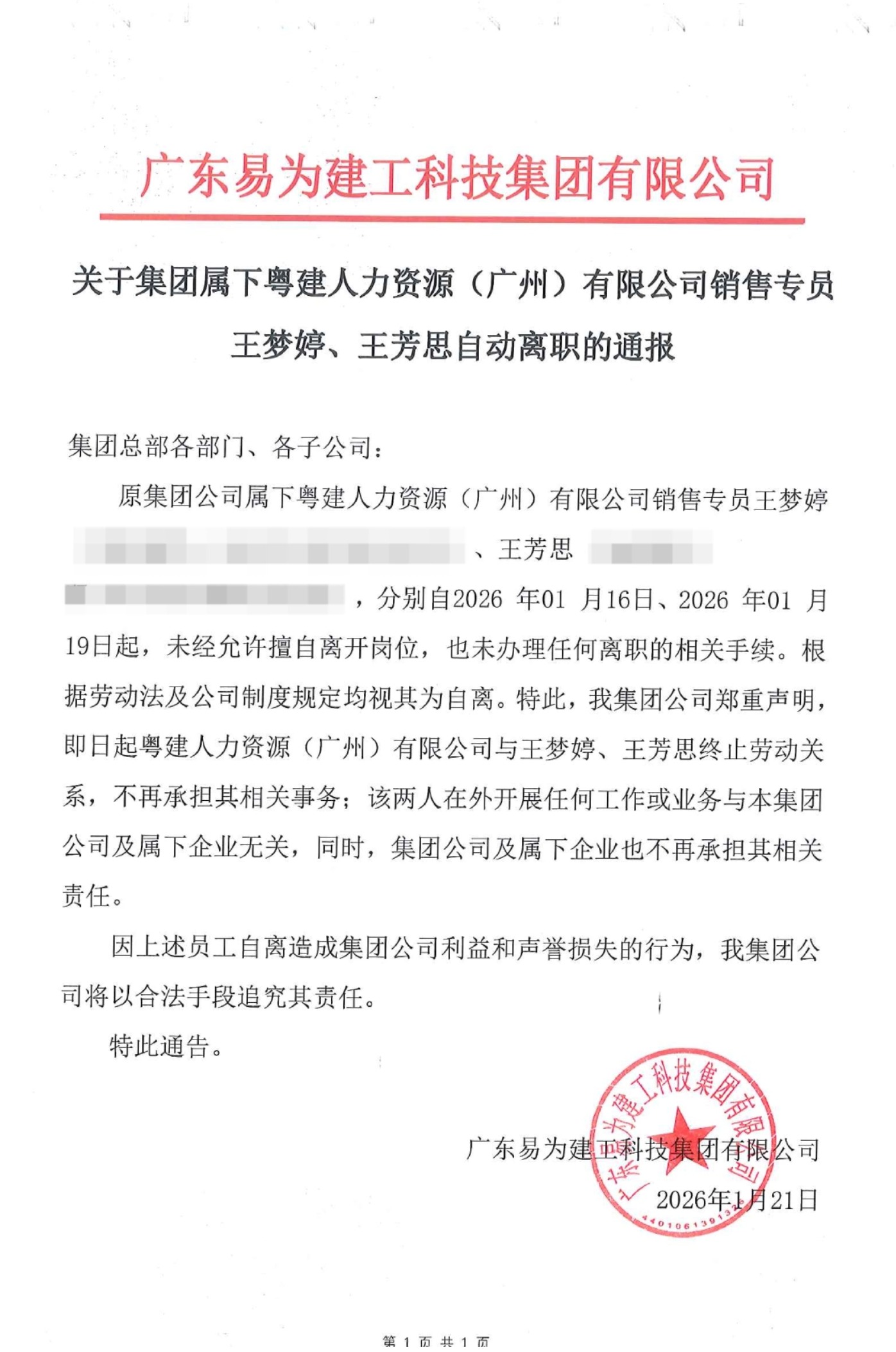 原集团公司属下粤建人力资源(广州)有限公司销售专员王梦婷、王芳思,分别自2026年01月16日、2026年01月19日起,未经允许擅自离开岗位,也未办理任何离职的相关手续。根据劳动法及公司制度规定均视其为自离。特此,我集团公司郑重声明,即日起粤建人力资源(广州)有限公司与王梦婷、王芳思终止劳动关系,不再承担其相关事务;该两人在外开展任何工作或业务与本集团公司及属下企业无关,同时,集团公司及属下企业也不再承担其相关责任。
