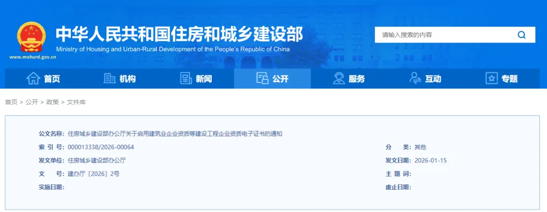 住建部:1月17日起,住建部核准的建设工程企业资质启用电子证书,不再发放纸质证书
