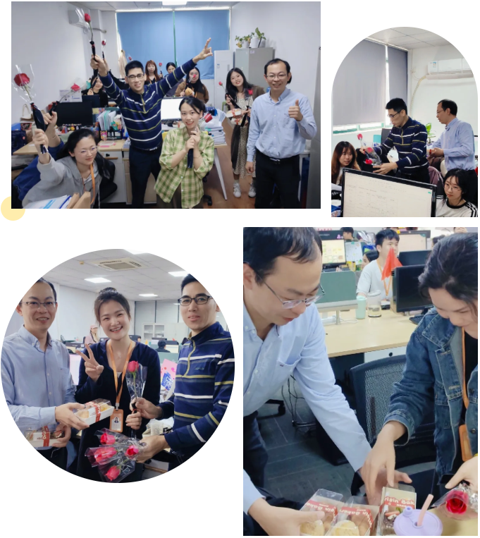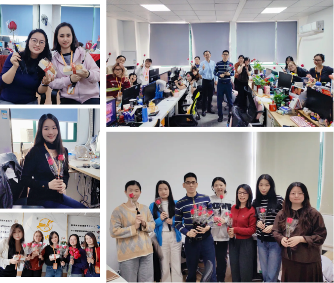 卢校长与林董事化身“送福使者”,亲手将一束束娇艳的花束与切块蛋糕送到每一位女同事手中。“节日快乐,感谢你们的辛勤付出!”两位领导与女同事们亲切交谈,充分肯定大家在工作中展现的专业担当与温柔坚韧,感谢她们以柔肩扛起责任,为集团发展注入源源不断的“她力量”。